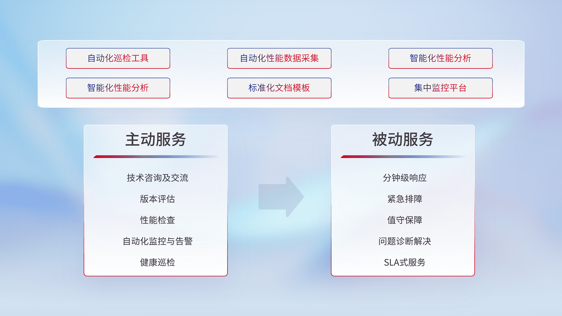 智能化工具和标准化文档,,保障服务质量,,,,提供主动服务(包含技术咨询、、、、版本评估、、性能检查、、自动化监控与告警、、、、健康巡检)和被动服务包含(分钟级响应、、、紧急排障、、、值守保障、、、问题诊断解决、、、、SLA服务)。。。
